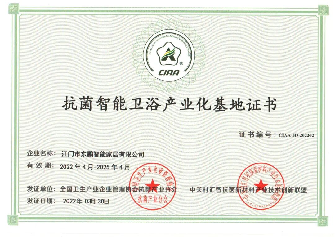 东鹏江门基地始终坚守品质初心,专注健康卫浴产品技术升级,严格按照ISO9001标准建立完善的生产管理体系、质量管理体系和服务管理体系。2022年,经中关村汇智抗菌新材料产业技术创新联盟授权,东鹏江门基地荣获抗菌智能卫浴产业化基地证书,在行业中树立“抗菌引领者”形象。