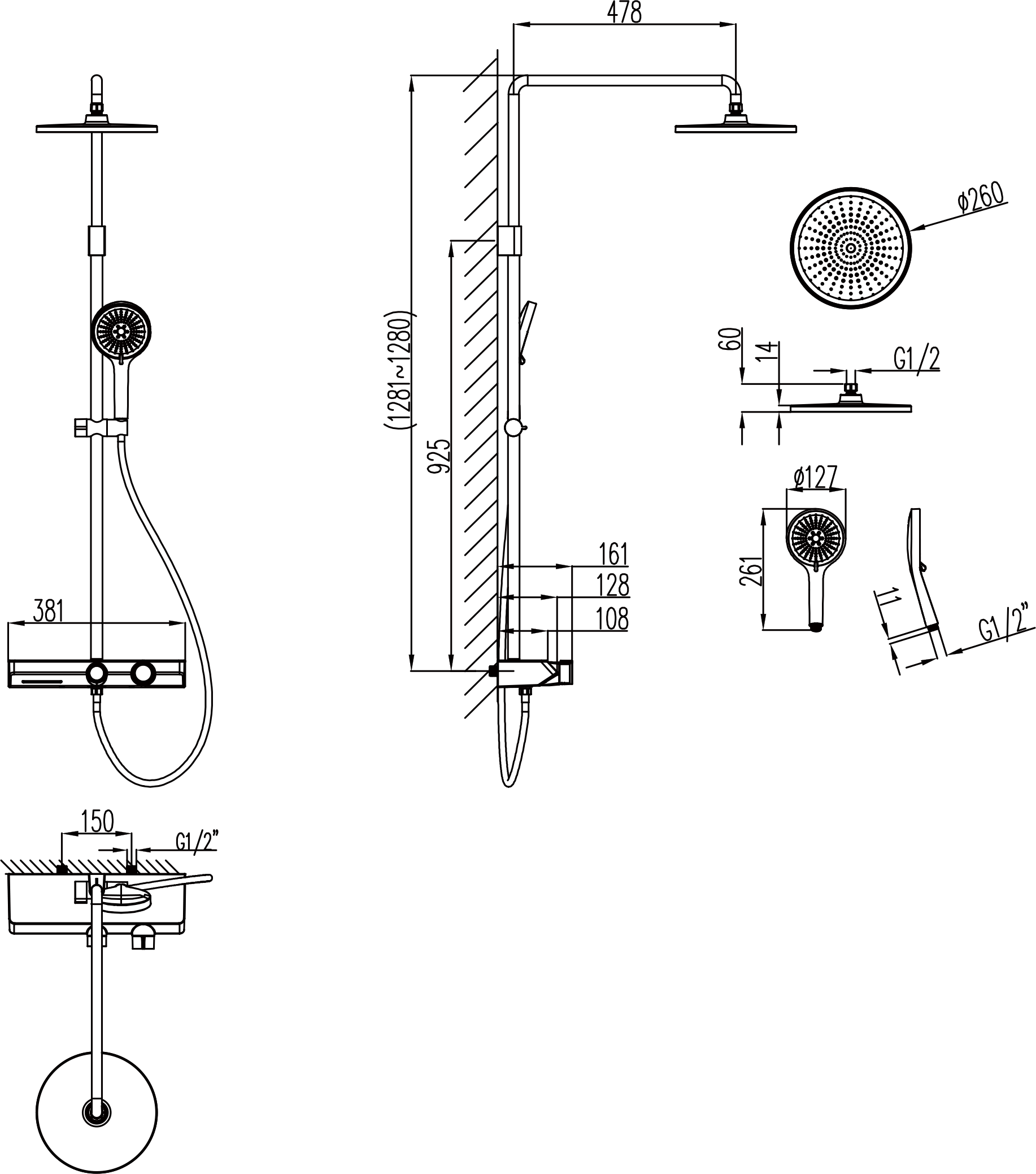 配置:10寸圆形顶喷 5寸三功能圆形手持