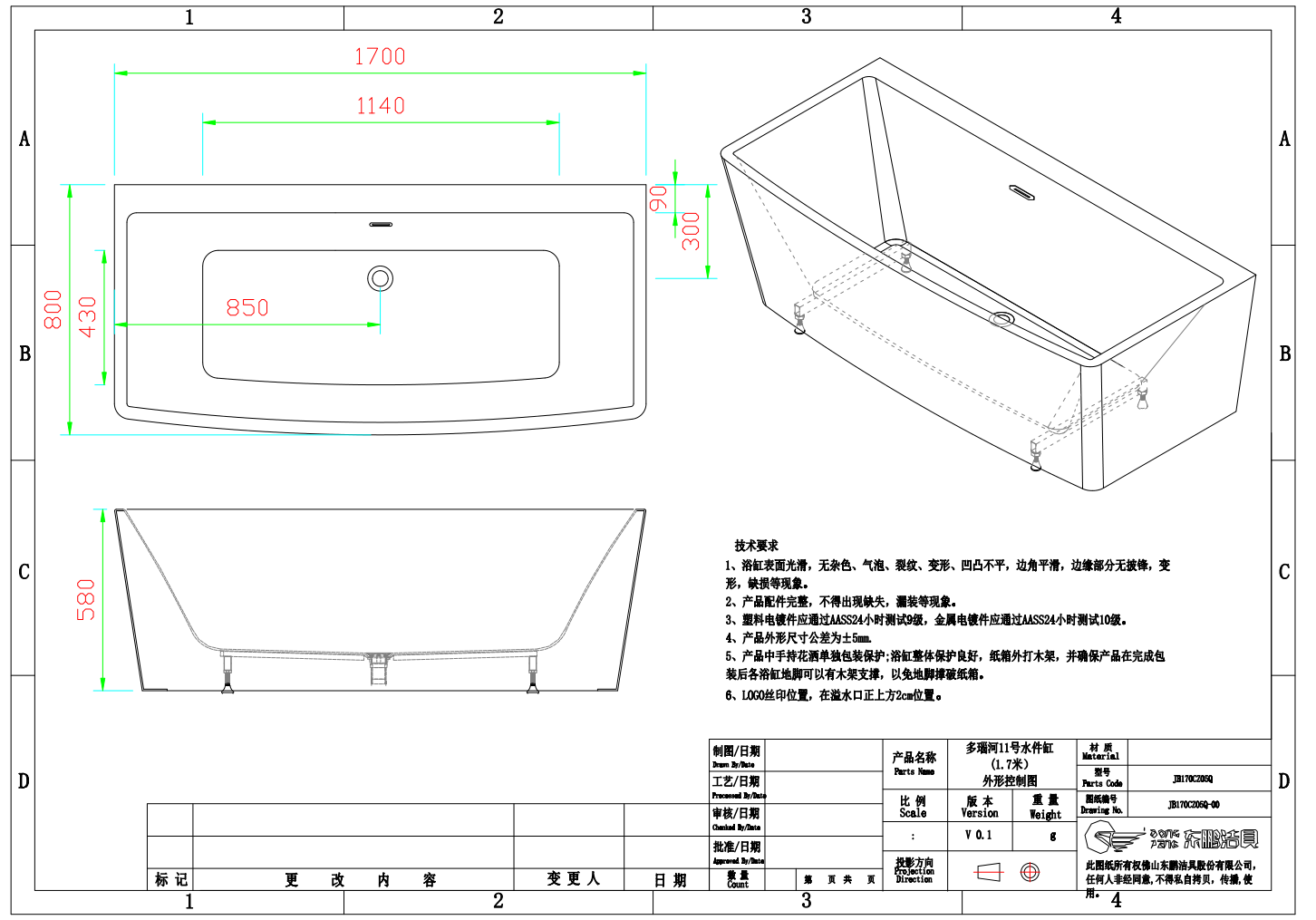 产品规格:1700x800x580mm 去水距离:850X300mm实物与标准尺寸允许有 ±5mm 的误差产品型号:JB170CZ05Q